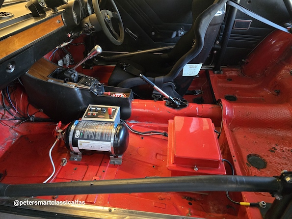 Carried out full engine rebuild, lightened and balanced, high compression pistons, lightweight flywheel, sports clutch, aluminium radiator electric thermostatically controlled fan, oil cooler, twin Dellorto 45mm carburettors. Engine set up on rolling road producing 160 Bhp. New high torque starter motor, lightweight racing alternator, new Alfaholics stainless steel exhaust system.